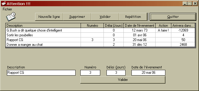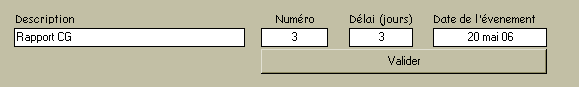 Délai: (si omis = 0) :nombre de jours permettant de vous prévenir avant la butée réelle de l'événement... dans l'exemple ci dessus, le rapport CG doit être remis le 20 mai... mais je serai prévenu 3 jours avant de la butée, pour être sur de ne pas l'oublier (donc le 17 mai).