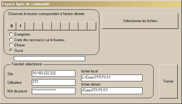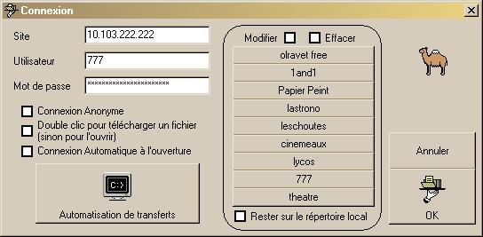 Pour une connexion à un serveur Anonyme, cochez la case "Anonyme".Quand vous cliquez sur un des neuf boutons (1234.... à la première utilisation) vous enregistrez les paramètres pour ce site, ainsi que la position de votre arborescence locale.