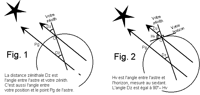 La position de l'astre ainsi calculée est aussi celle de son "pied" à la surface du globe. Cela signifie que, si à l'instant de votre mesure au sextant, un observateur s'était trouvé sur la terre à l'endroit précis dont vous venez de calculer les coordonnées, il aurait vu l'astre que vous avez visé très exactement au-dessus de sa tête, à sa verticale, à son zénith.