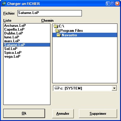 Note: Les fichiers de la version 1.0 à 1.5 ne sont pas entièrement compatibles, donc l'extension (.dat) est devenue .Lop (line of position). Pour récupérer vos anciennes droites, renommez manuellement ces fichiers et enregistrez les ensuite.