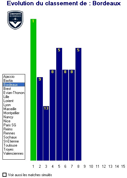 En fonction de la date, les classements vont se calculer pour chaque journée jouée. Vous pouvez choisir une équipe et voir ainsi l'évolution de son classement. Dans la figure ci contre nous en étions au huitième jour. En cochant "Voir aussi les matches simulés" vous aurez de pris en compte dans les calculs vos simulations et vos espoirs de votre fichier.