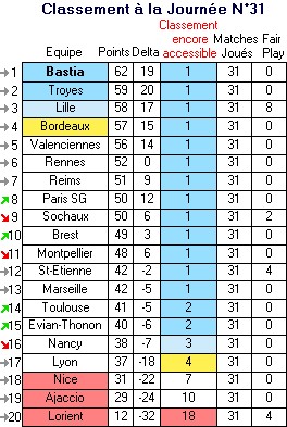 Dans cet exemple, à la journée 31 toutes les équipes jusqu'à la 13eme du classement peuvent encore théoriquement accéder à la 1ere place, mais Lorient, au mieux finirait 18eme est donc forcément reléguée en L2. Le calcul se fait en fonction des matches restant à jouer pour chaque équipe, en considérant la situation idéale où tous les matches seraient gagnés et que les autres équipes, pendant ce temps n'évolueraient pas... Ce qui est quand même peut probable, dans certains cas...