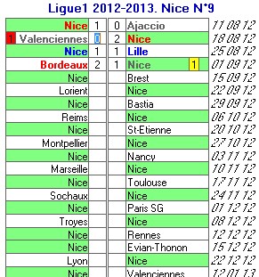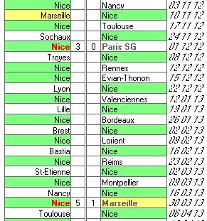 Les 38 matches sont alignés dans l'ordre chronologique, en vert clair, l'équipe choisie. - A gauche = équipe