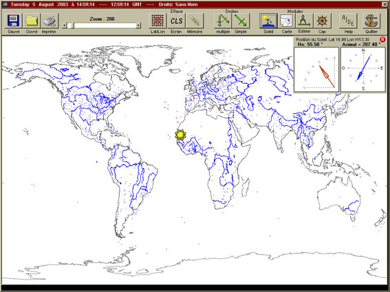 Si l'astre est le soleil, ce module nous donne également la position du point sans ombre, le pied du Soleil (ligne du haut Latitude et Longitude)