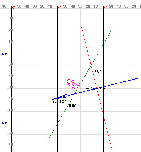 La droite de 16h01 est en rouge, la droite transportée est verte, le point d'estime est le rond rouge dessiné, le pointillé rouge est la route suivie entre les mesures.