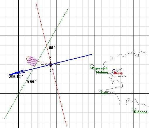 Entre temps votre bateau s'est déplacé au cap 285° à la vitesse moyenne de 4 nuds. Le module Estime nous calcule une position pour la deuxième mesure cette position: