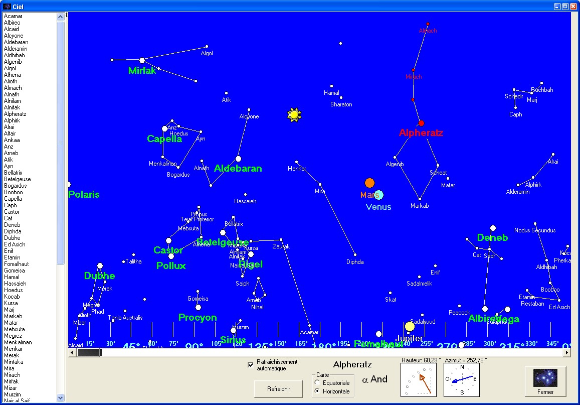 Voici l'aperçu du ciel actuellement visible. A la position insérée et selon l'heure et la date de votre système.